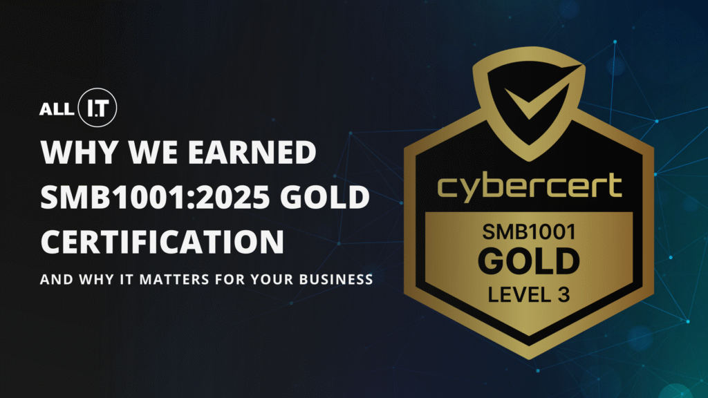 Late last year, All IT Services achieved SMB1001:2025 Gold level certification. We pursued this because we wanted to get behind a framework that brings real value to the medium-sized Australian businesses we work with. If we’re going to recommend it, we need to apply it ourselves first.